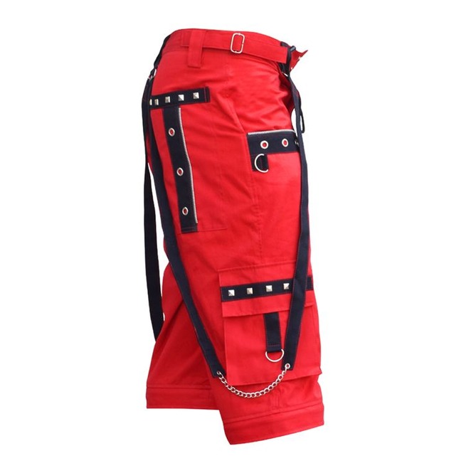 Men Gothic Red Short Red Threads Black Straps Punk Metal Chain Cyber