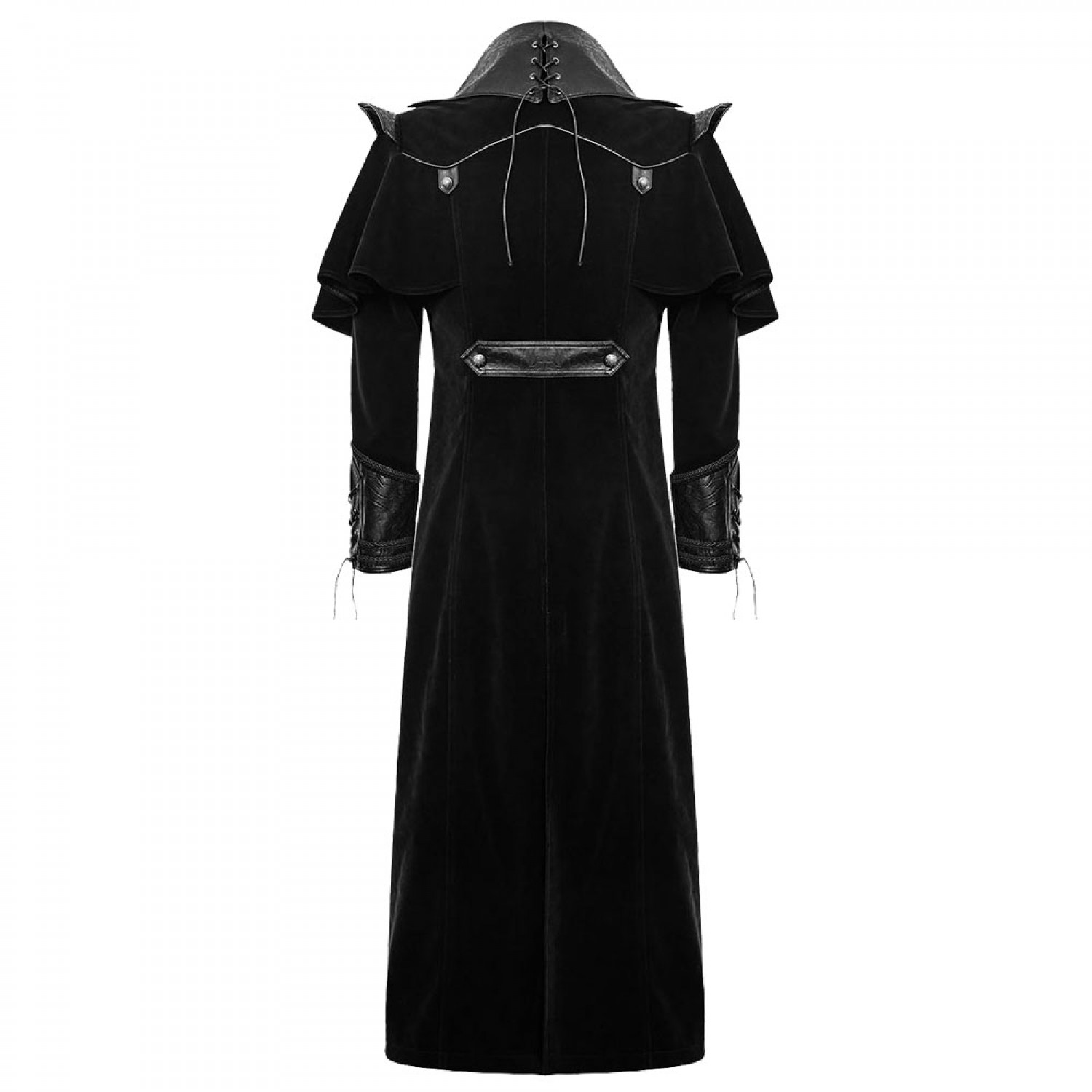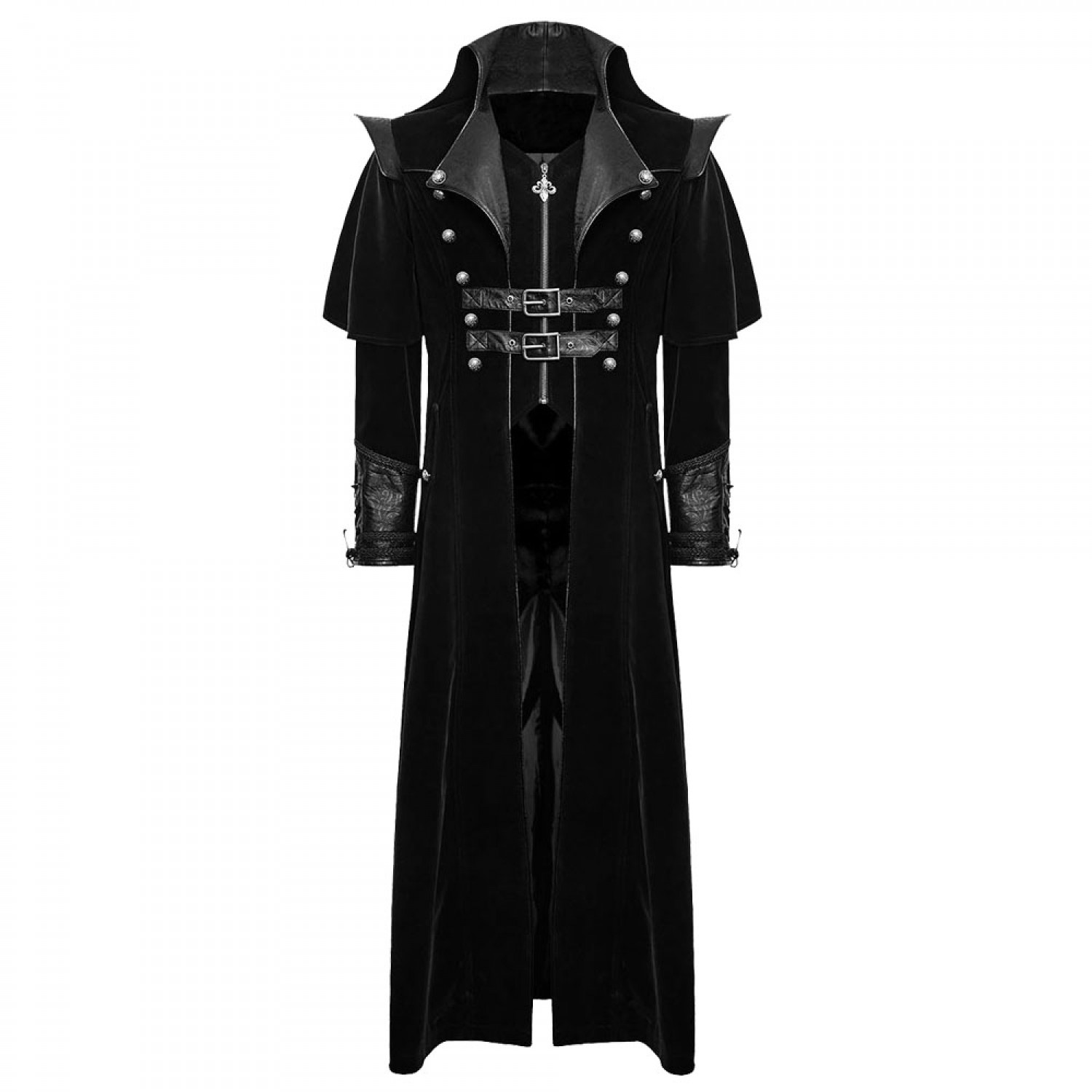 Men Gothic Steampunk Coat VTG Highwayman Long Coat Simply amazing vintage-inspired mens long coat, cut from super-soft, top-quality twill polyester featuring custom black faux leather contrasts with embossed pattern. Unique design with a front cutaway and zip fastening - complete with 2 adjustable buckled faux leather straps across the midsection.