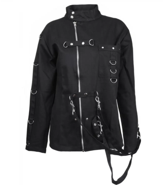 Details: Color: Black Women's high neck jacket Off-center zip fastening and lace upfront Breast pocket, studs, D-rings, and bondage strap detail 100% Cotton