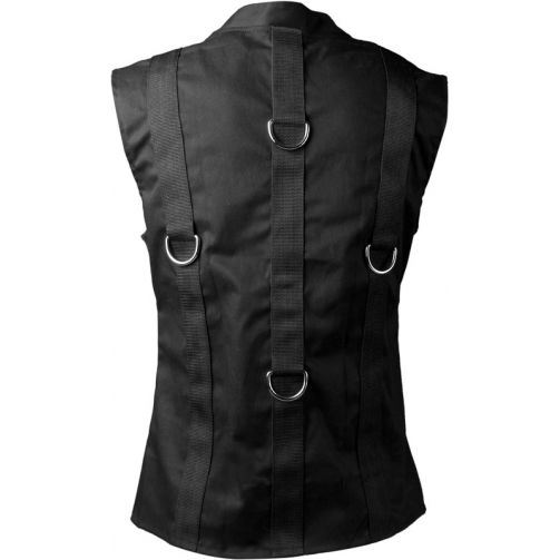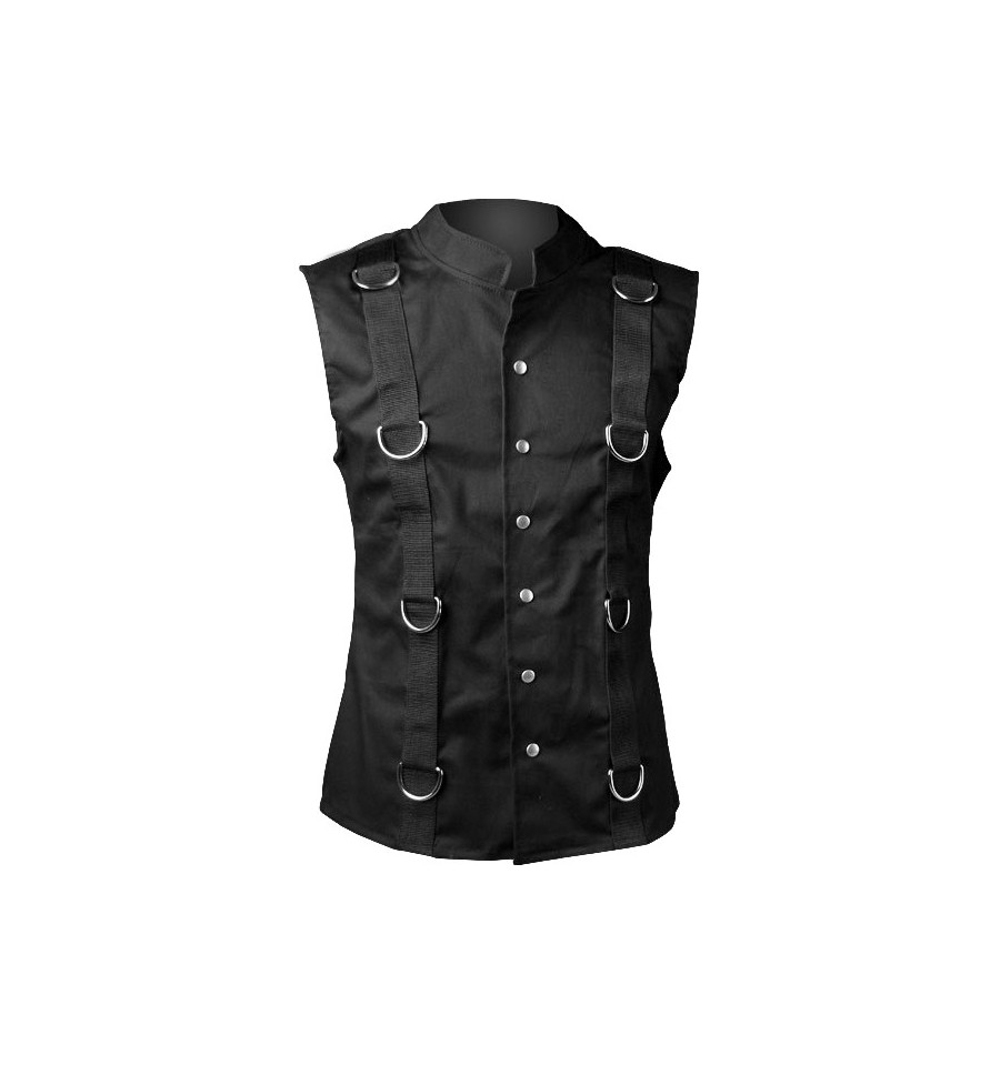 sleeveless ring vest design uniform style collar and neck metallic pressure buttons webbing straps solid metal d-rings black denim fabric (100% cotton)