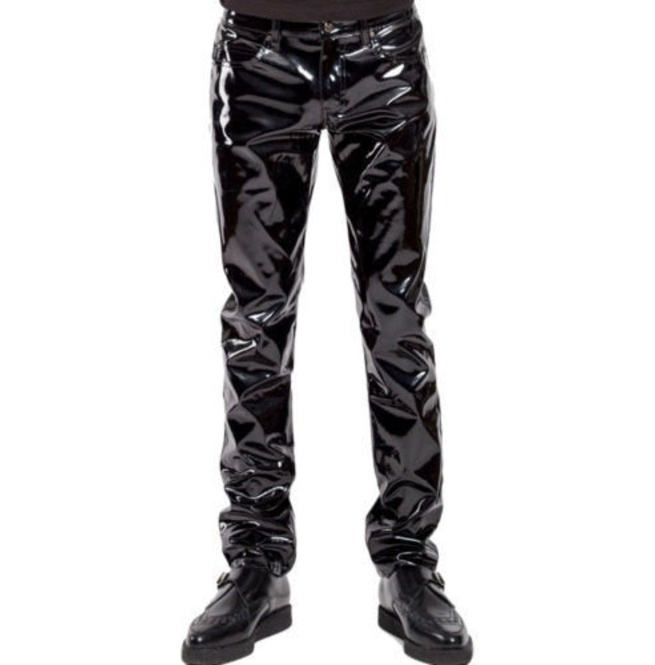 Vinyl mens five pocket slim straight jeans Pants in rocker fit. These jeans have a shiny faux leather pvc and edgy look. Silver metal front button, rivets and zipper closure