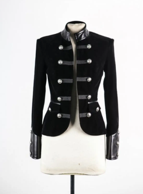 Gothic Black Velvet Military Jacket Leather Accents Coat