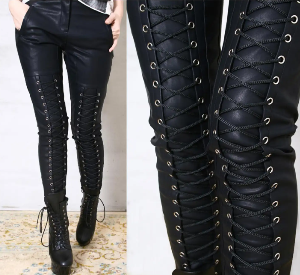 Punk Rock Biker Leather Pant Women Slim Fit Laces Leather Pant